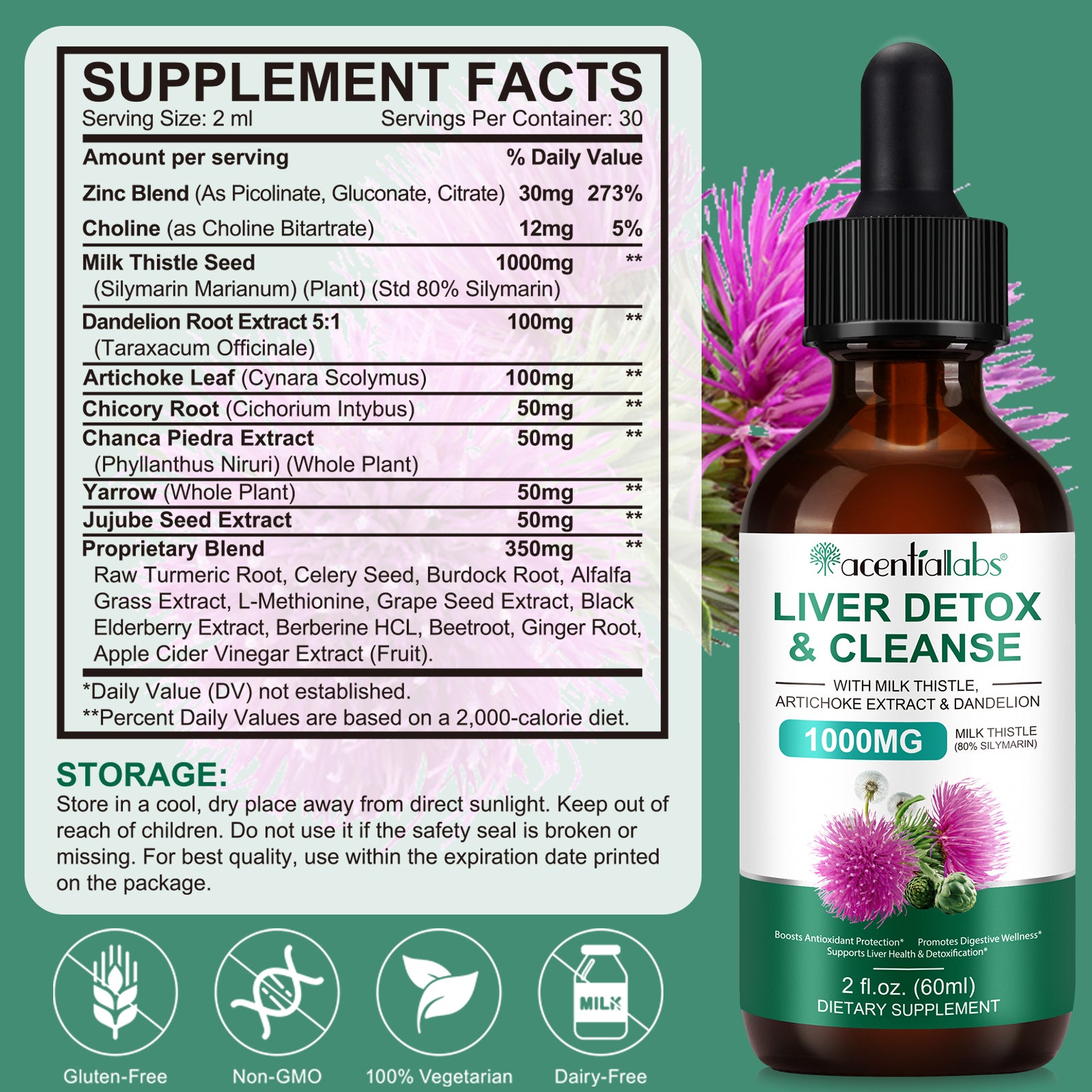 Amestec de zinc 30 mg, colină 12 mg, semințe de armurariu 1000 mg (80% silimarină), extract de rădăcină de păpădie 5:1 100 mg, frunze de anghinare 100 mg, rădăcină de cicoare 50 mg, extract de Chanca Piedra 50 mg, coada-șoricelului 50 mg, extract de semințe de jujube 50 mg, amestec brevetat 350 mg (rădăcină de turmeric crudă, semințe de țelină, rădăcină de brusture, extract de iarbă de lucernă, L-metionină, extract de semințe de struguri, extract de soc negru, clorhidrat de berberină, sfeclă roșie, rădăcină de ghimbir, extract de oțet de mere). Alte ingrediente: apă purificată, glicerină vegetală.